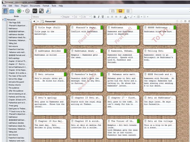 Scrivener has taken care of that matter by inventing something called the ‘corkboard’: