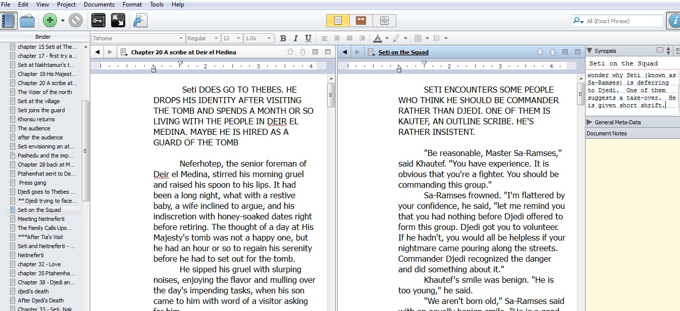 …And here it is. Each square (they look to me like index cards) is a chapter. You can label the chapters as final drafts, needing work, whatever. One last feature that I find particularly useful is the split screen. Recently, I was working on a chapter that referred directly back to something that happened near the beginning of the story. I didn’t want to open two pages and go back and forth. Scrivener allows you to split the screen: