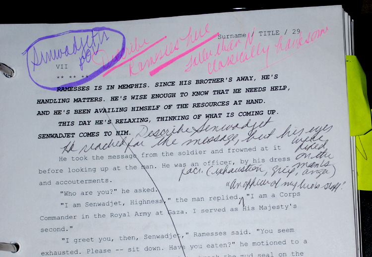 Post-it notes, or reasonable facsimiles thereof, are very useful for marking places (‘Oh – that’s right! I edited to here!’), marking thoughts (make sure you don’t get cheap imitations because they’ll fall off, and you will face your greatest fear: that your inspired edit will be lost forever and your powerful intellect, having decayed rather badly, will not be able to retrieve the perfect word in the perfect location.)