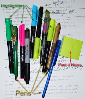 You need highlighters in various colors. Why? Well, what if you highlight something in pink and then think of something else that needs to be done with the highlighted passage, but is different? Pink won’t work, it’ll be confusing. Besides, hot pink is something of which I can only stand so much. Purple, I think. Or maybe blue…