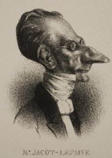 I tried it.  Truly I did.  It should have worked.  The background image was perfect, and I had my adjusted head.  Unfortunately, I learned to my dismay that while the head, somewhat over-refined, was not so bad from a close vantage point, when you put it at a distance it looked somewhat like a snipe.  Or,  perhaps, like Bob Hope.  In fact, it reminded me forcibly of a cartoon by Honore’ Daumier: