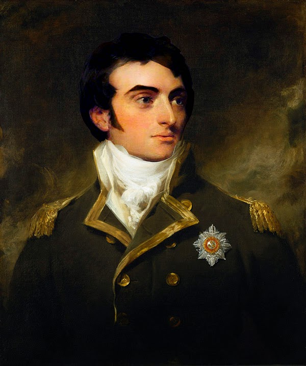 Well, there was Lawrence’s portrait of Admiral Pellew, who fought in Britain’s navy during the Napoleonic wars.    The body looked pretty good from the neck down.  From the hair, crew cuts were a Napoleonic invention, but I didn’t plan to use the head.  It only remained to paste the head I had designed atop the body.  I set to work and finished it fairly quickly.  The proposed image is below: