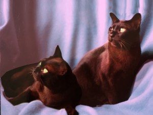 But life does go on, and grief must be dealt with and resolved in one way or another. I didn’t expect to ‘replace’ my boys, but I needed to have pets in their places, so Boomer and BJ came to me. Boomer is a Burmese. BJ’s father was a Burmese (a particularly nice one!), so though he’s a Bombay and black, he looks, through the face, like my first Burmese. That is when I encountered the echoes.