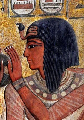 After a lot of searching I chose to use this bas-relief from the tomb of my hero.  With the sort of arrogance that utterly flabbergasts me whenever I encounter it, people who came to the tomb in the early nineteenth century decided that they would cut it away from the wall and take it back to Florence with them. It is now in the Louvre.  This depiction seemed to be the best prospect, though I could have wished the headdress had been a little different.   People, looking at long hair and what they perceive as makeup (kohl circling the eyes; worn by both sexes in Egypt), tend to think “Ah!  A woman!”  For those in the know, those two gold strands around the king’s neck are military decorations of the highest order – ‘the Gold of Honor’.  This is a warrior-king.  I mention it in the story: